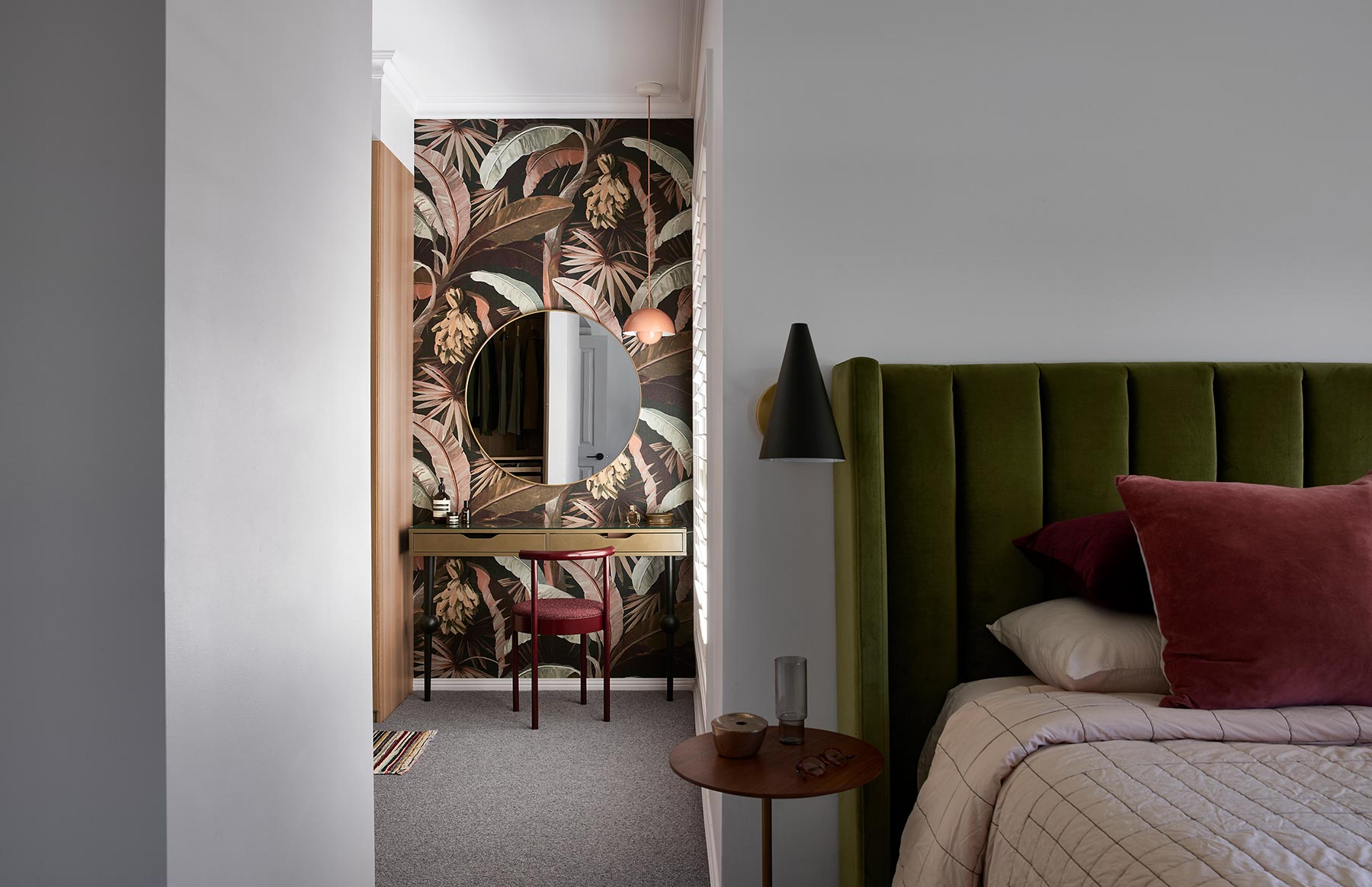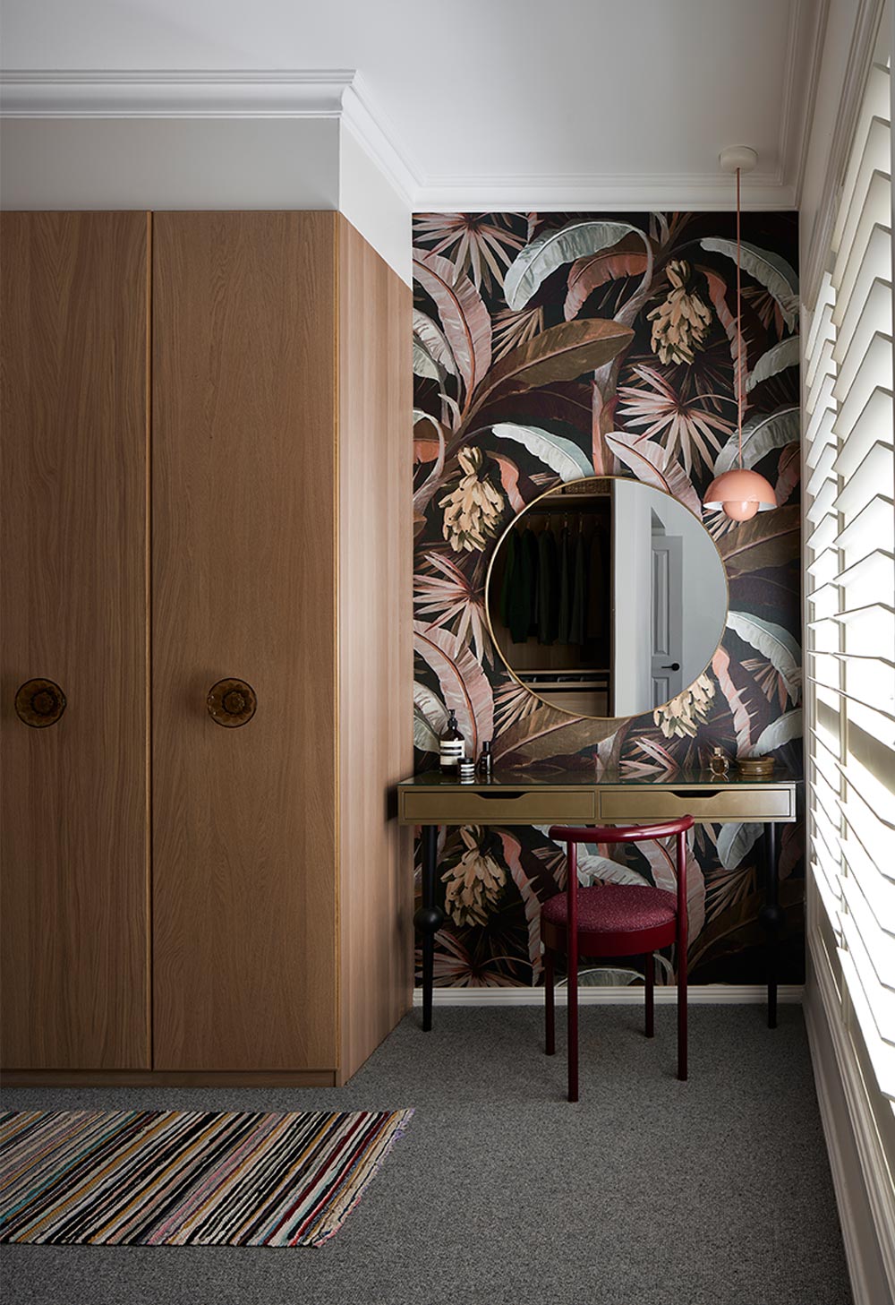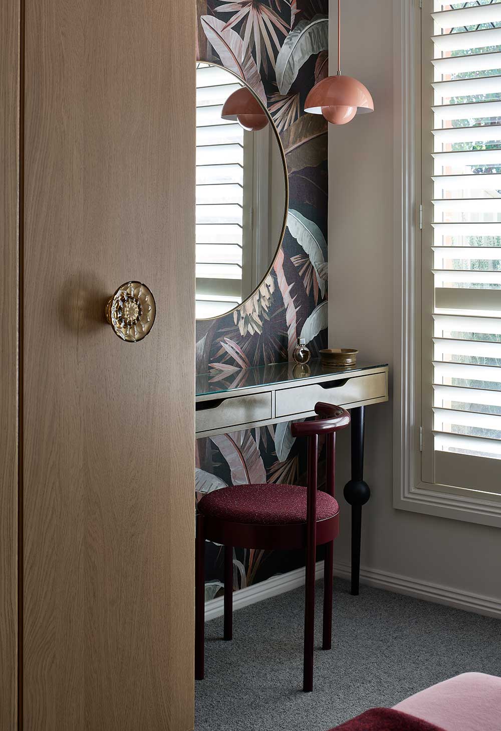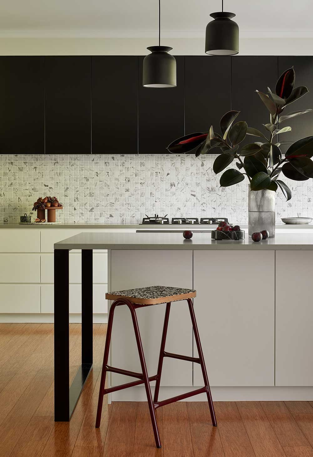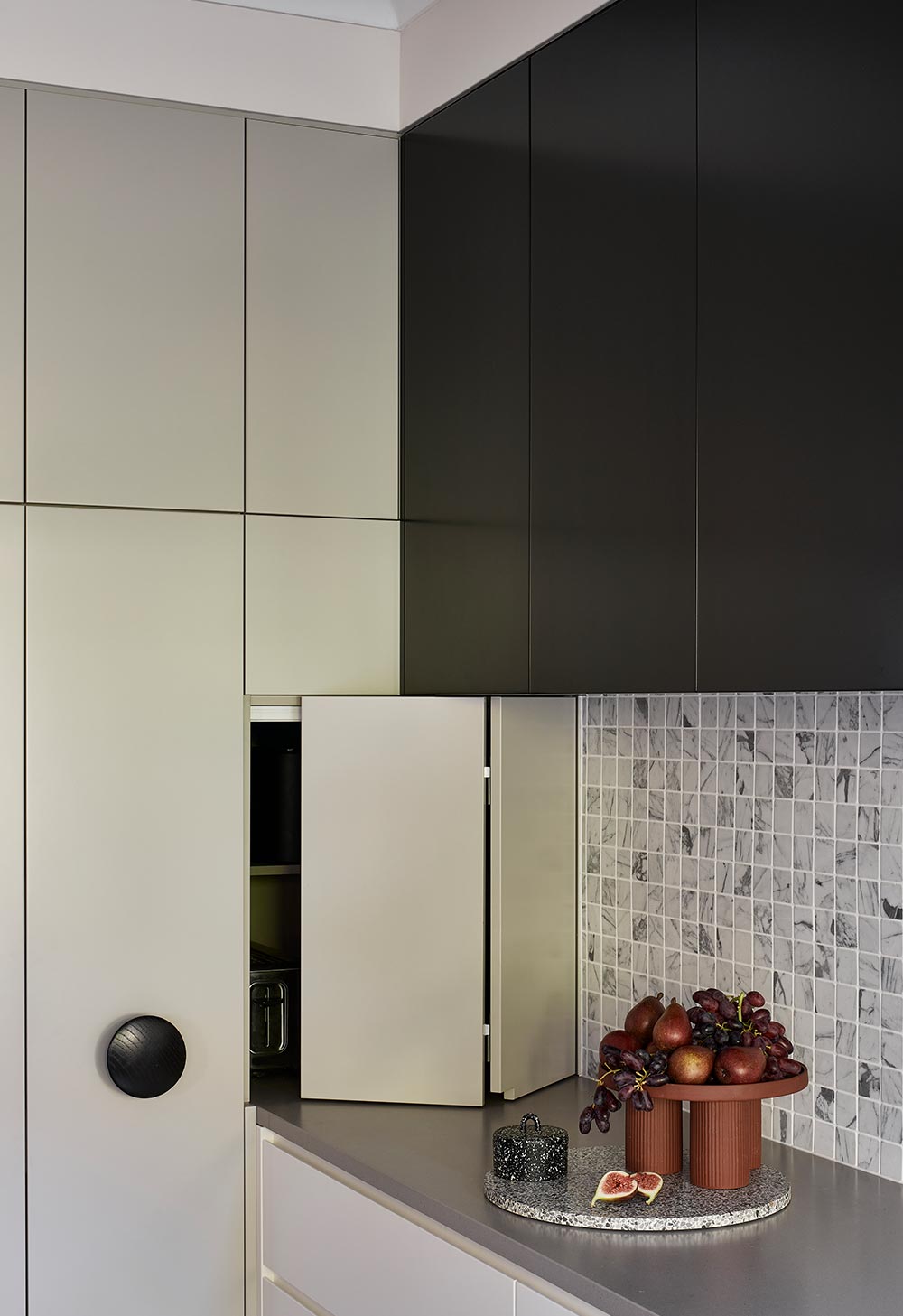 Certainly not a couple to shy away from colour, two decades of living with an electric blue benchtop drove the request for a neutral toned kitchen this time around. The reconfigured space now accommodates many guests for cocktails or breakfast around its deep island, while integrated appliances and hidden nooks ensure an orderly and easily cleanable backdrop to the open plan living.