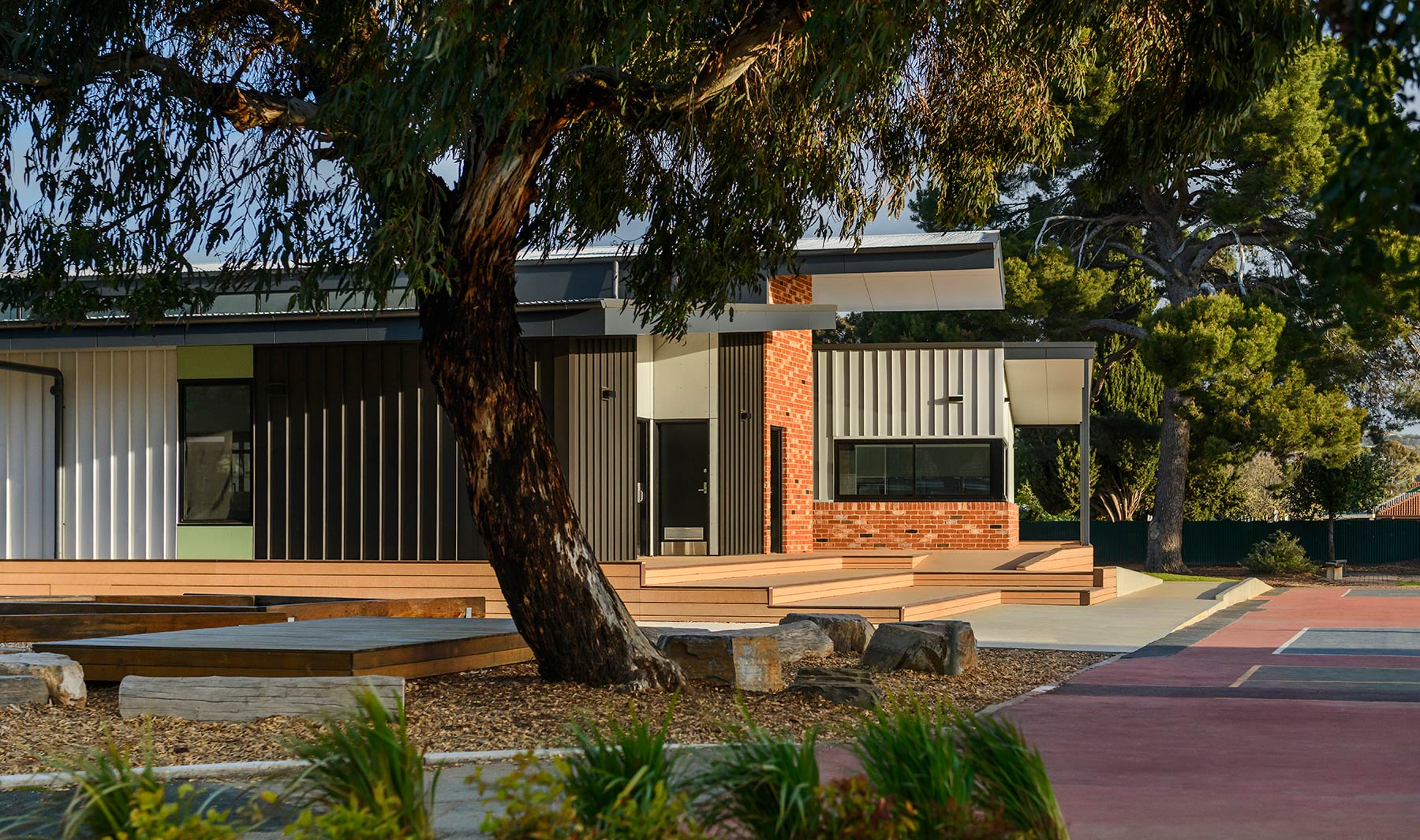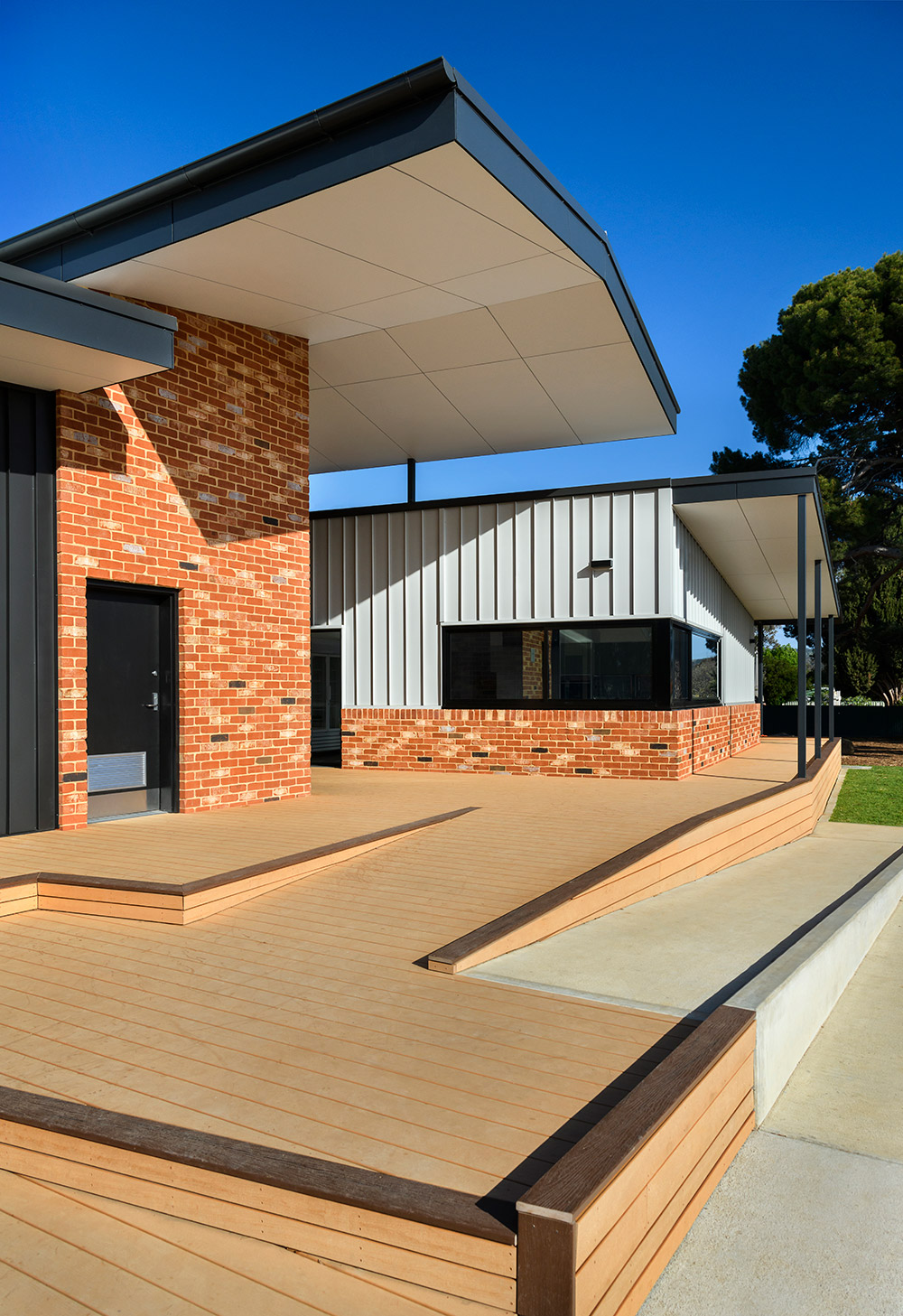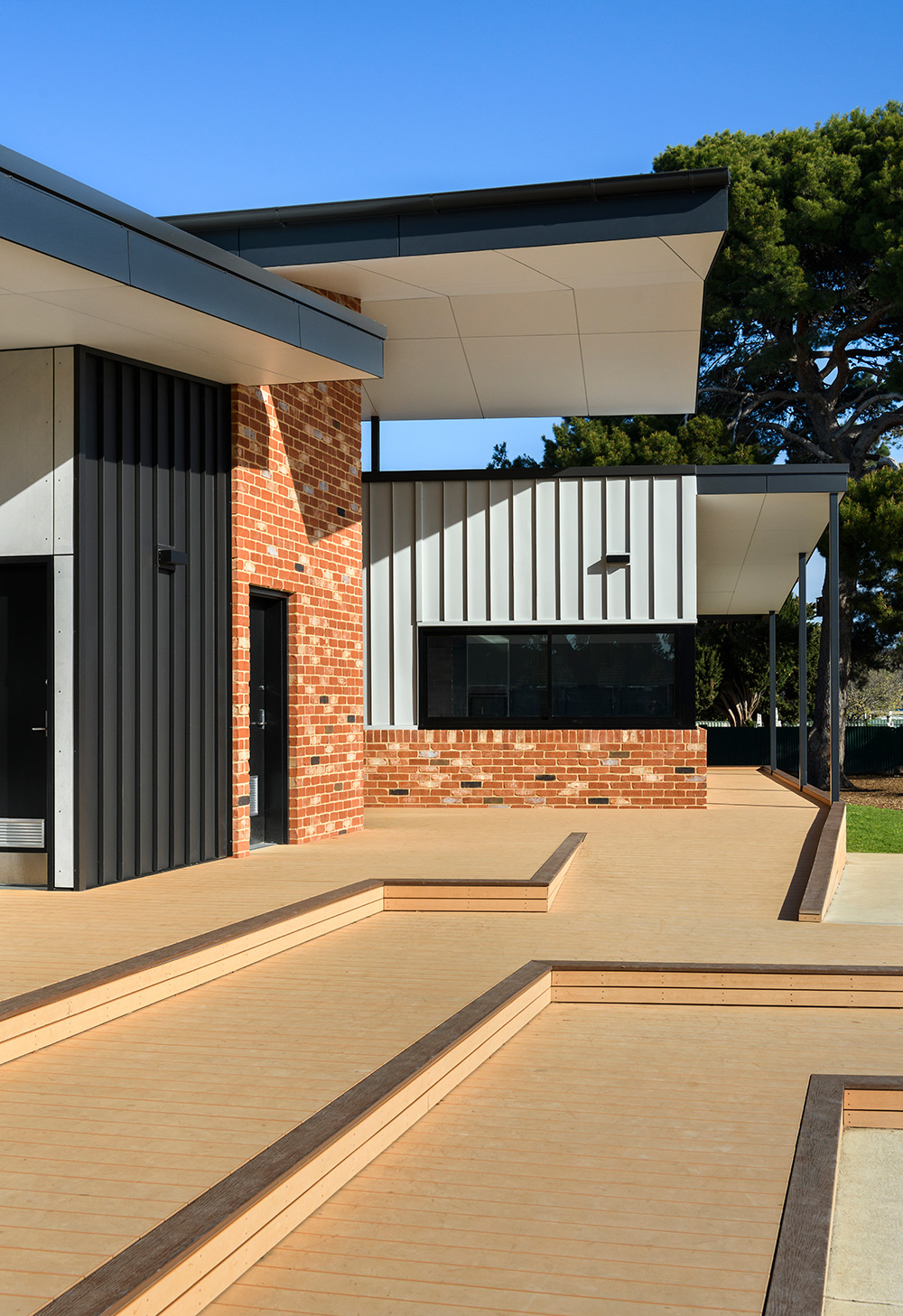 The school’s desire for a strong connection to the outdoors is reflected in the design of these new facilities, with a central semi covered deck linking the east and west wings with smaller classroom decks surrounding the building envelope. The form and materiality complement its setting and serves as a reflection on the school’s heritage and lasting presence along Brighton Road.