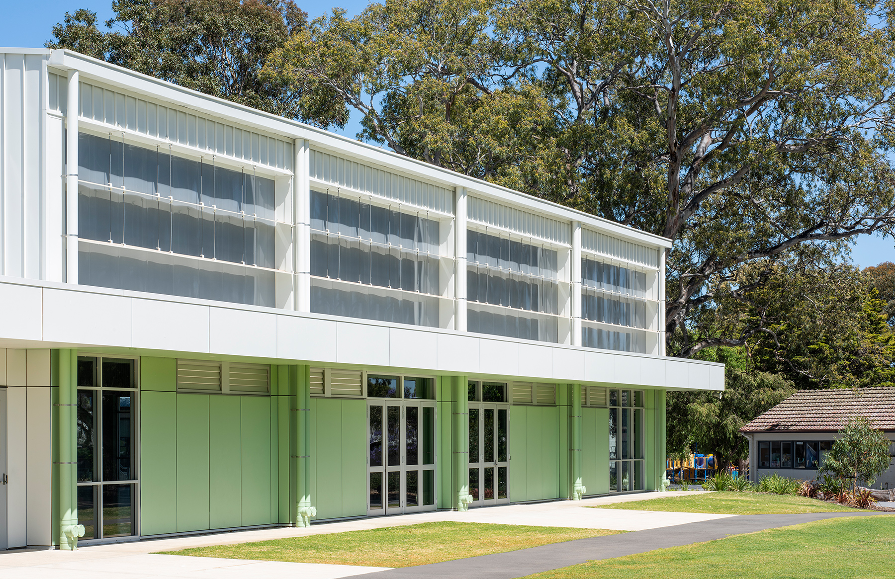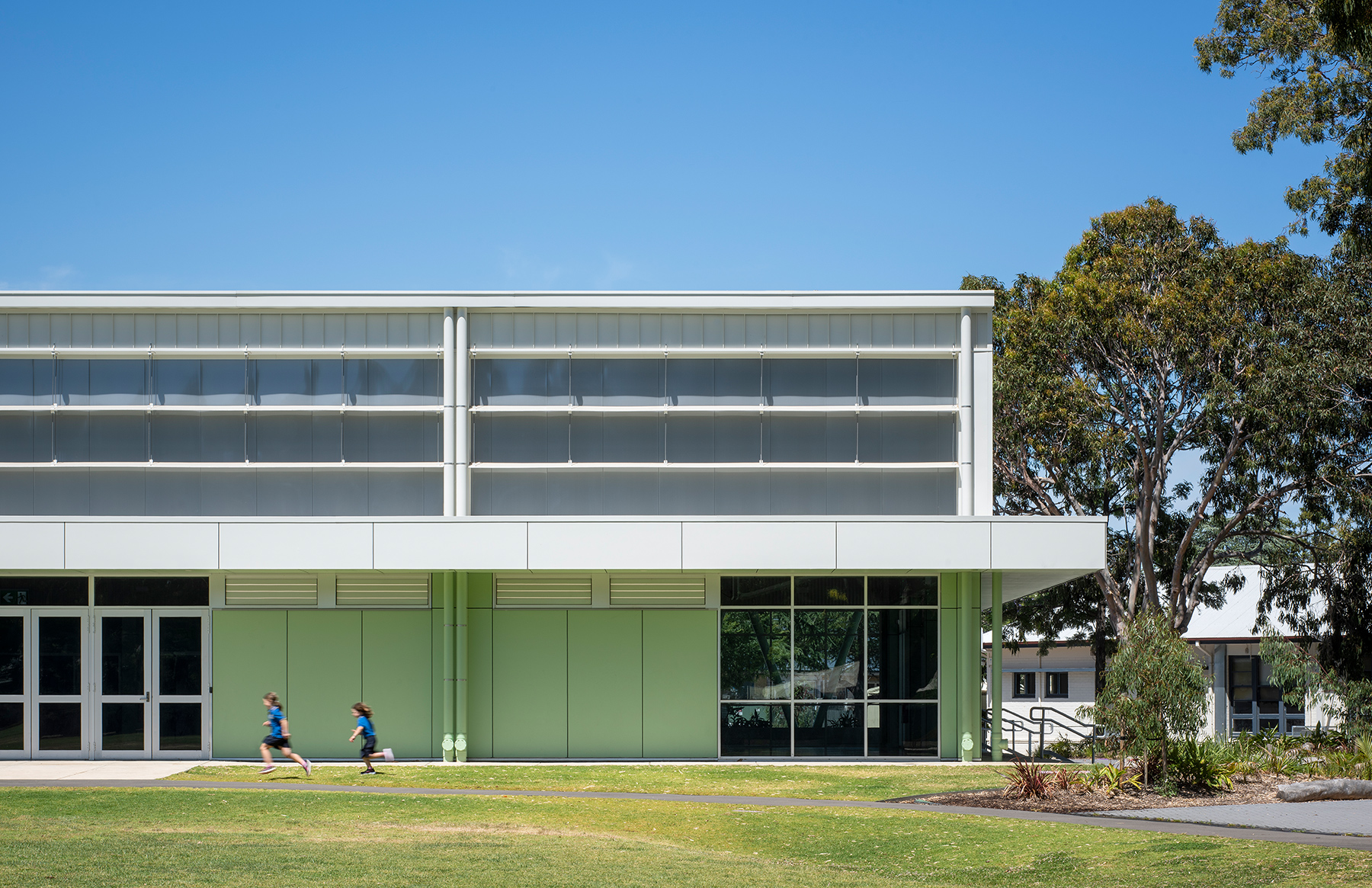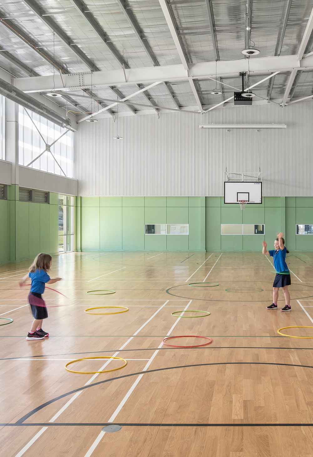 The solution, a 600m2 flexible activity zone with interconnected learning and support spaces, designed to cater to a multitude of school community needs. Supporting more than just the physical education and performing arts curriculums, every space is crafted with purpose and versatility in mind. Strategic transparency and thoughtful planning ensure seamless integration with the site, while a palette of subtle green and warm white cladding pay homage to the surrounding natural environment and add a touch of playful whimsy.