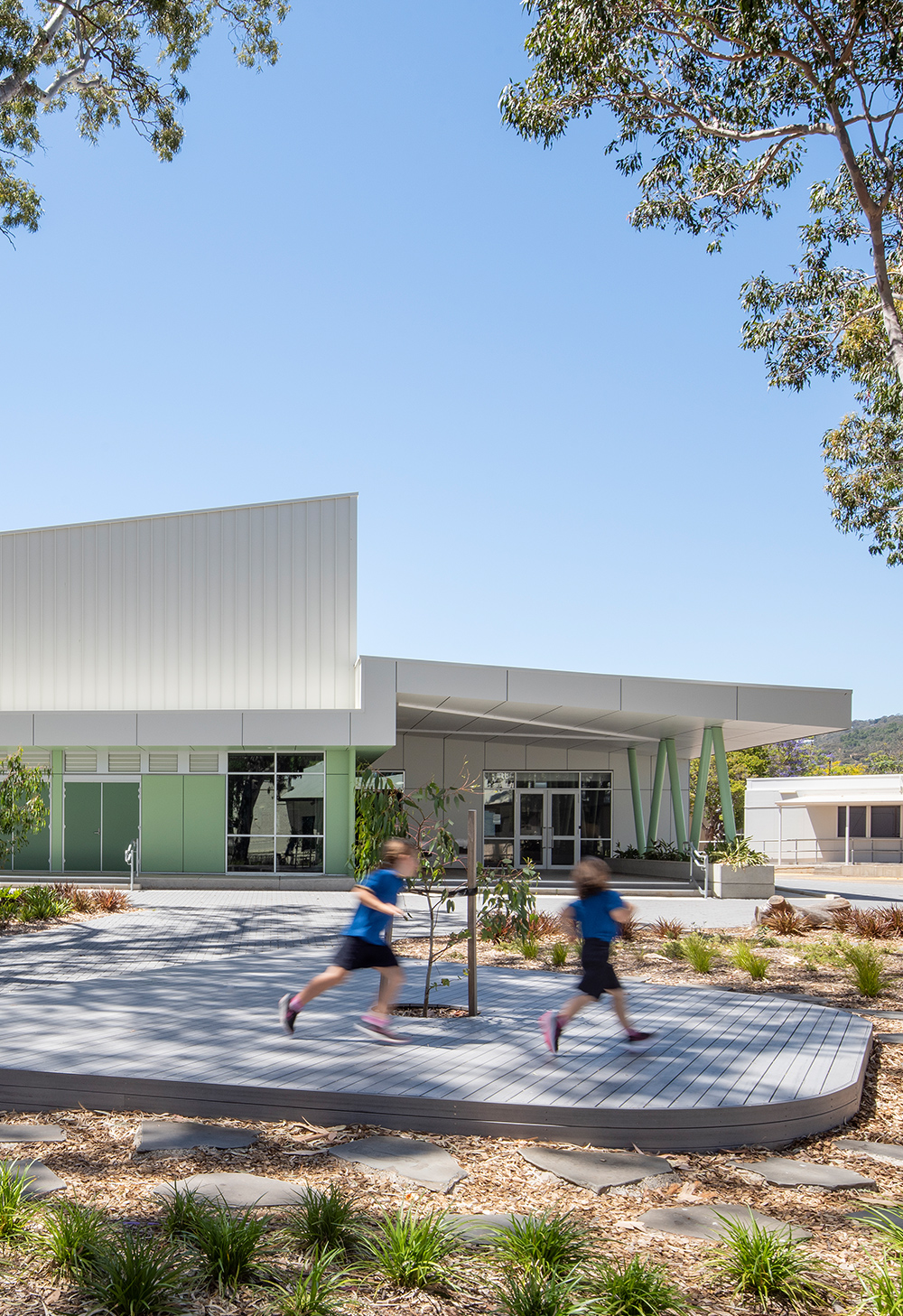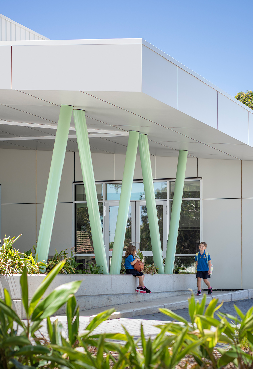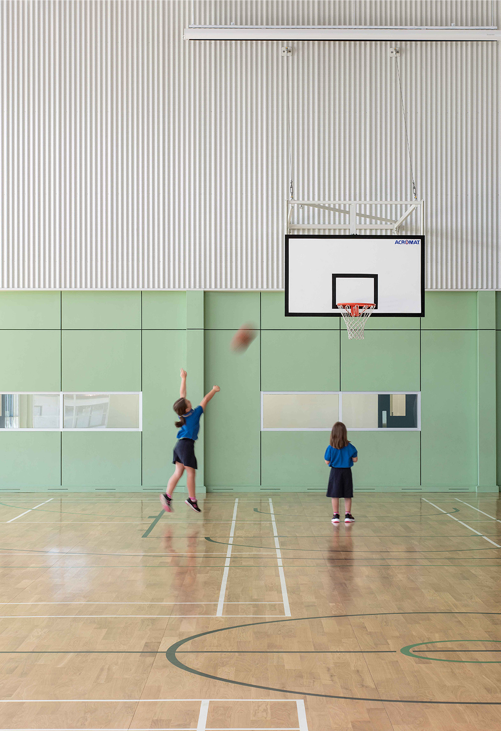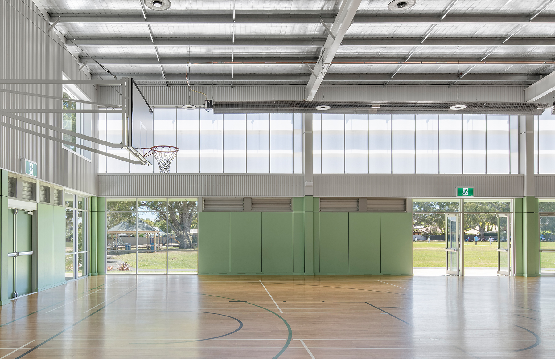 The solution, a 600m2 flexible activity zone with interconnected learning and support spaces, designed to cater to a multitude of school community needs. Supporting more than just the physical education and performing arts curriculums, every space is crafted with purpose and versatility in mind. Strategic transparency and thoughtful planning ensure seamless integration with the site, while a palette of subtle green and warm white cladding pay homage to the surrounding natural environment and add a touch of playful whimsy.