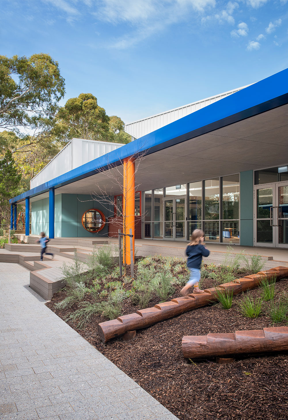 Nestled within a triangular wedge at the eastern most point of the school’s campus and flanked by a flowing creek and a sea of eucalypts, the site for the new Early Learning Hub provided the perfect opportunity to create immersive internal and external learning environment for curious young minds.